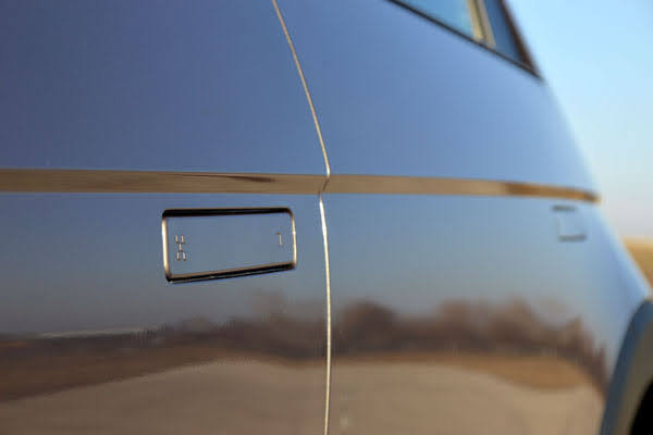 Ugyanez a pixelmotívum – bár kevésbé látványosan – végigvonul az autó oldalán is, hiszen azok a külső tükrökbe rejtett indexeken, valamint az autóba simuló oldalkilincseken is megjelennek. Persze, ezt a felületesen szemlélődő alig veszi észre a kagylóhéjszerűen a kerékjárati ívekre fekvő motorháztetőről induló és éppen 45 fokos szöget bezáró egyenesen lejtő hangsúlyos éltől. Többek között ez is egy olyan részlet, amely már a tanulmányon is megjelent, ahogyan a műanyag alsó védőelem formája is. A 45 tanulmány látványos felnije ugyan csak a 20 colos kerekekkel rendelkező csúcsváltozathoz járnak, ennek ellenére a 19 colos, légellenállásra optimalizált felnikkel sincs semmi baj.